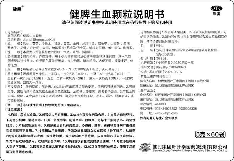 健脾和胃,养血安神。用于小儿脾胃虚弱及心脾两虚型缺铁性贫血;成人气血两虚型缺铁性贫血;症见面色萎黄或无华,食少纳呆,腹胀脘闷,大便不调,烦躁多汗,倦怠乏力。